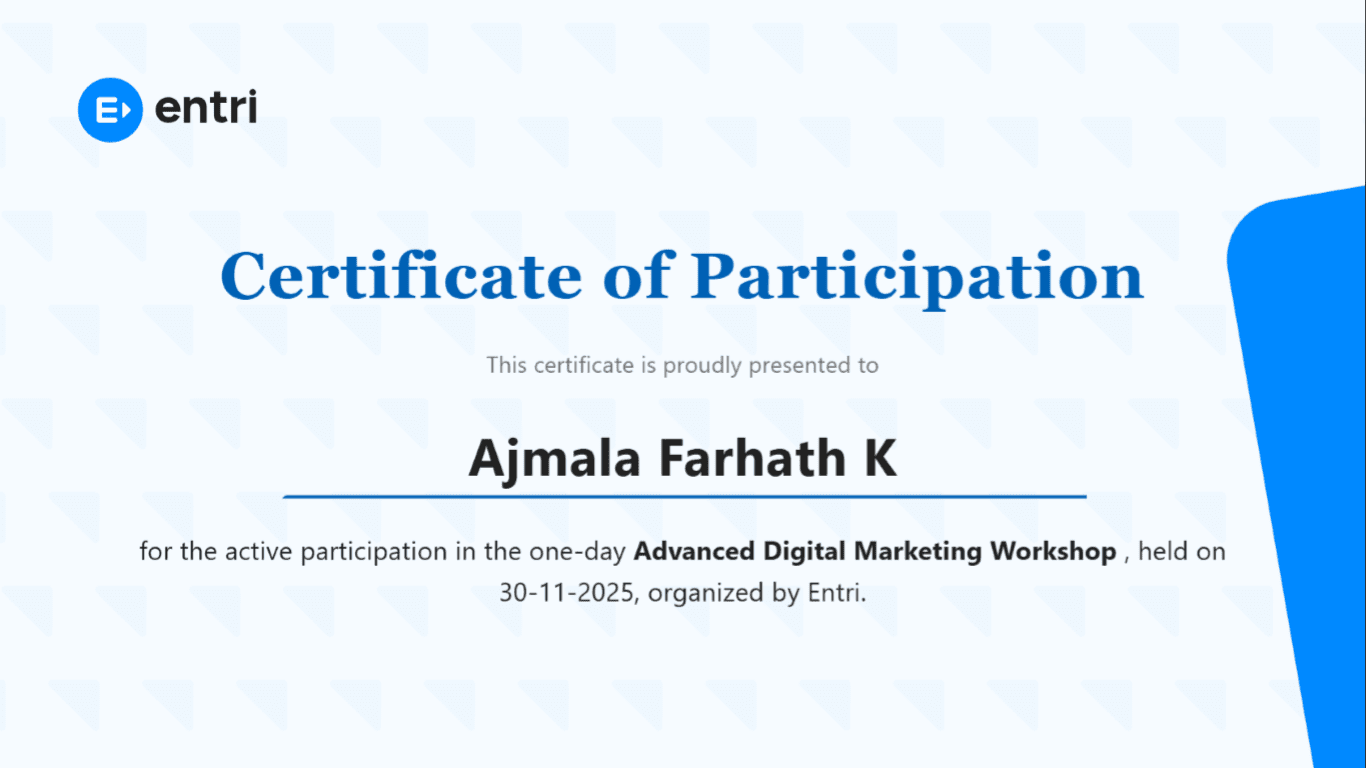 I’m Ajmala Farhath, a driven aspiring digital marketing strategist. I recently finished my Entri Elevate digital marketing course and realized how passionate I am about using digital platforms to build brands.
